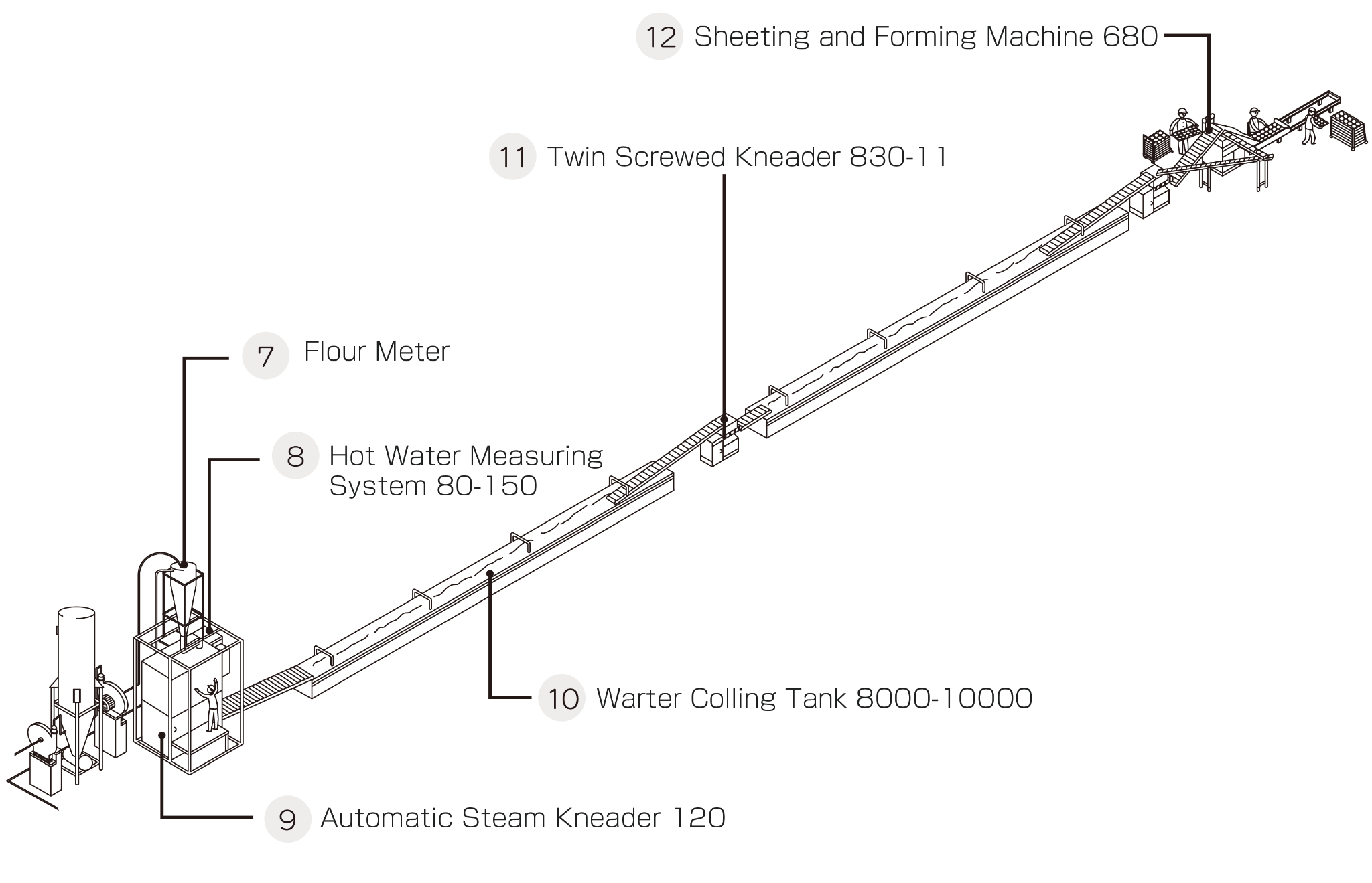 We design and manufacture plant systems that integrate all production processes. Each system is customized to meet the specific applications and needs of our customers.Below are the “Steaming” “Kneading” and “Forming” sections of the entire SNF200 plant process.