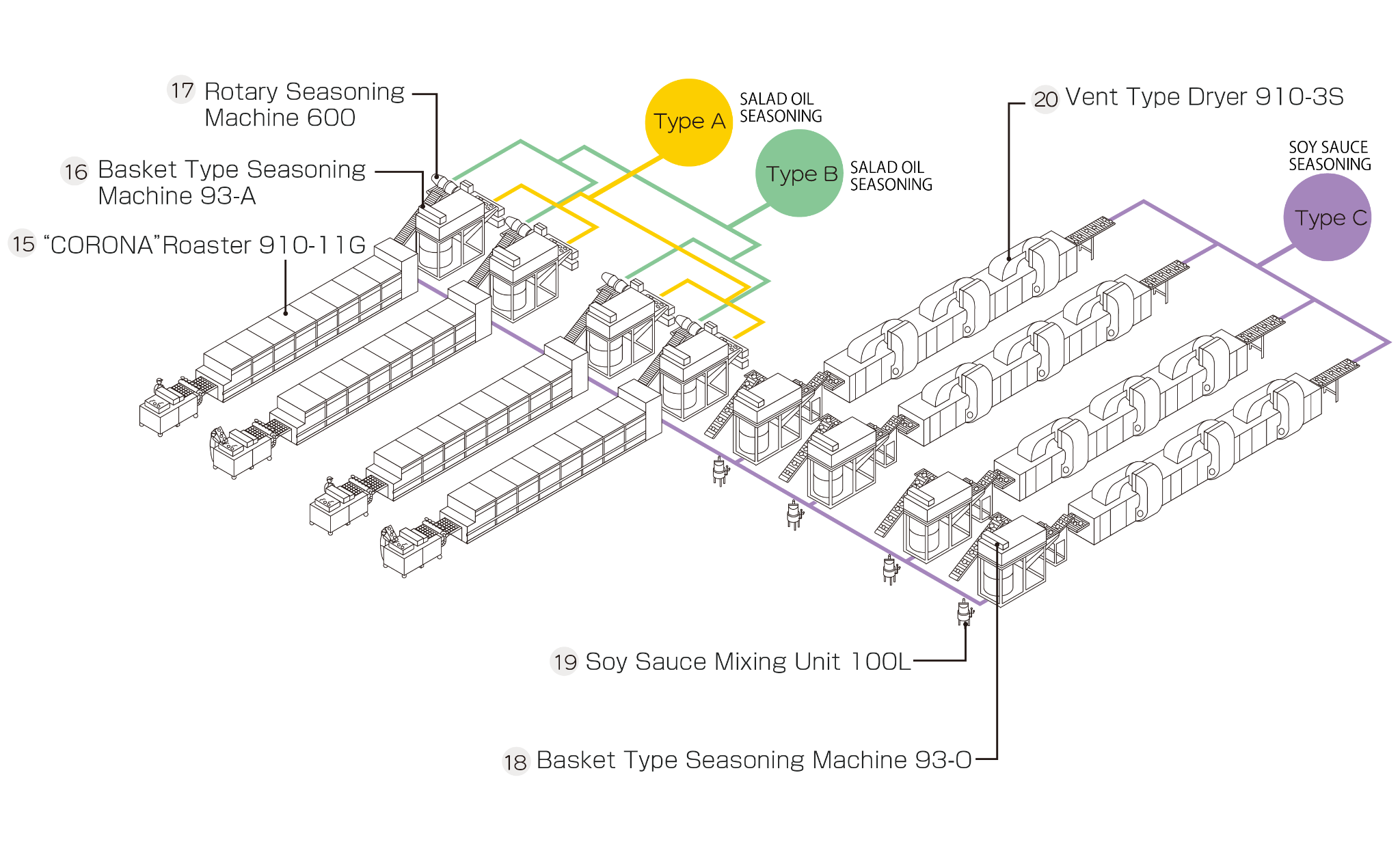 We design and manufacture plant systems that integrate all production processes. Each system is customized to meet the specific applications and needs of our customers.Below are the “Baking” and “Seasoning” sections of the entire SNB400 plant process.