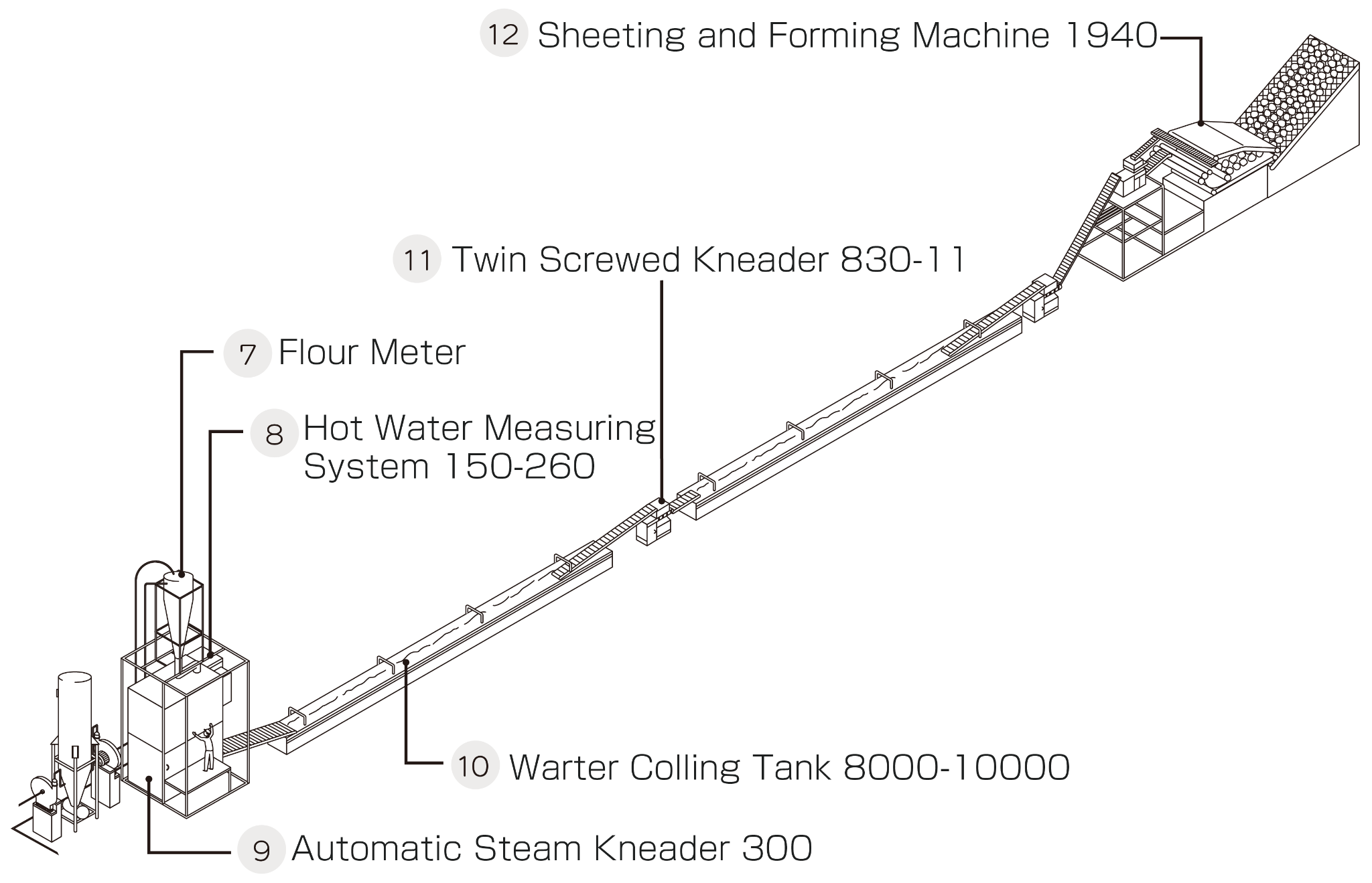 We design and manufacture plant systems that integrate all production processes. Each system is customized to meet the specific applications and needs of our customers.Below are the “Steaming” “Kneading” and “Forming” sections of the entire SNBI400 plant process.