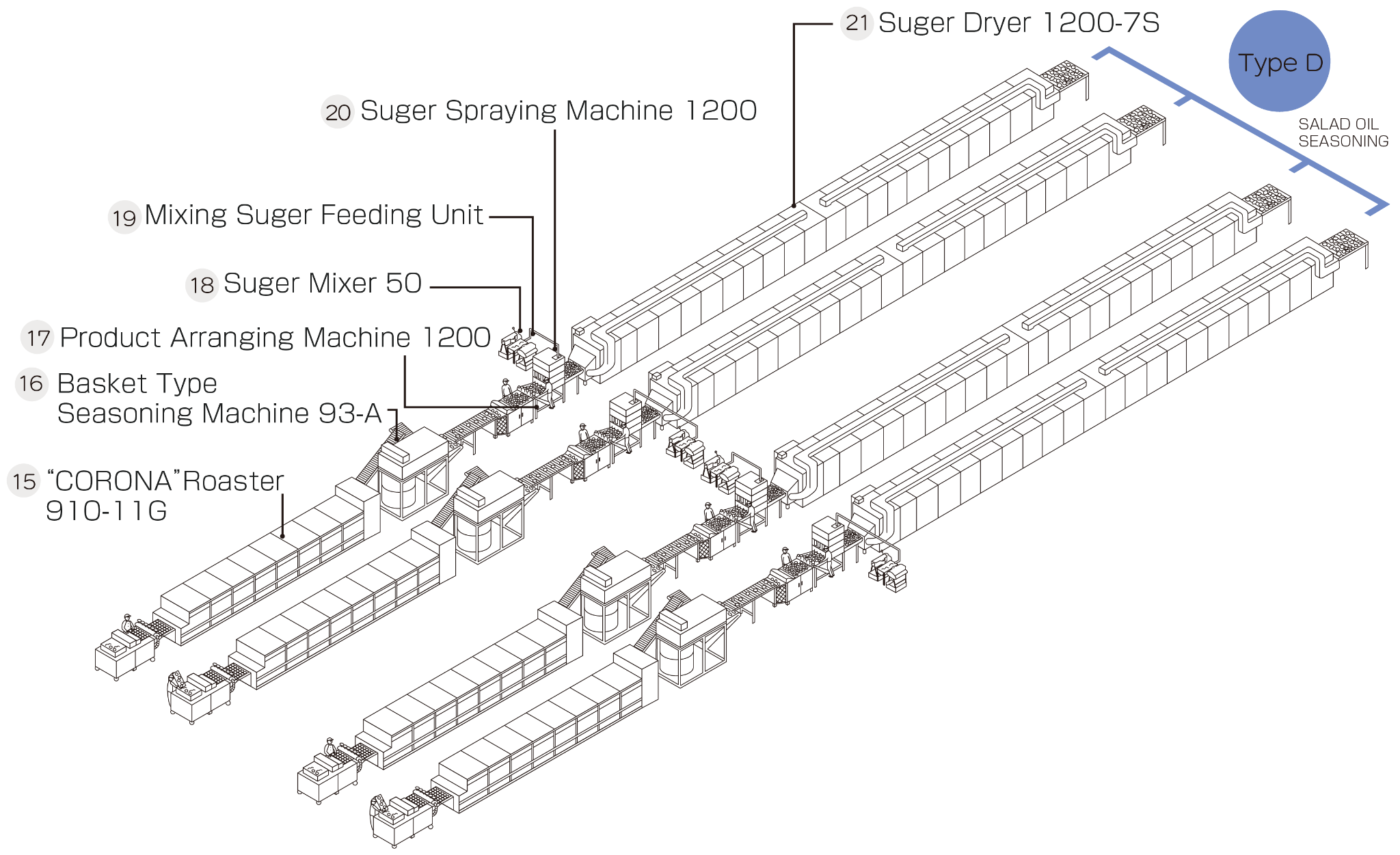 We design and manufacture plant systems that integrate all production processes. Each system is customized to meet the specific applications and needs of our customers.Below are the “Baking” and “Seasoning” sections of the entire SNBI400 plant process.