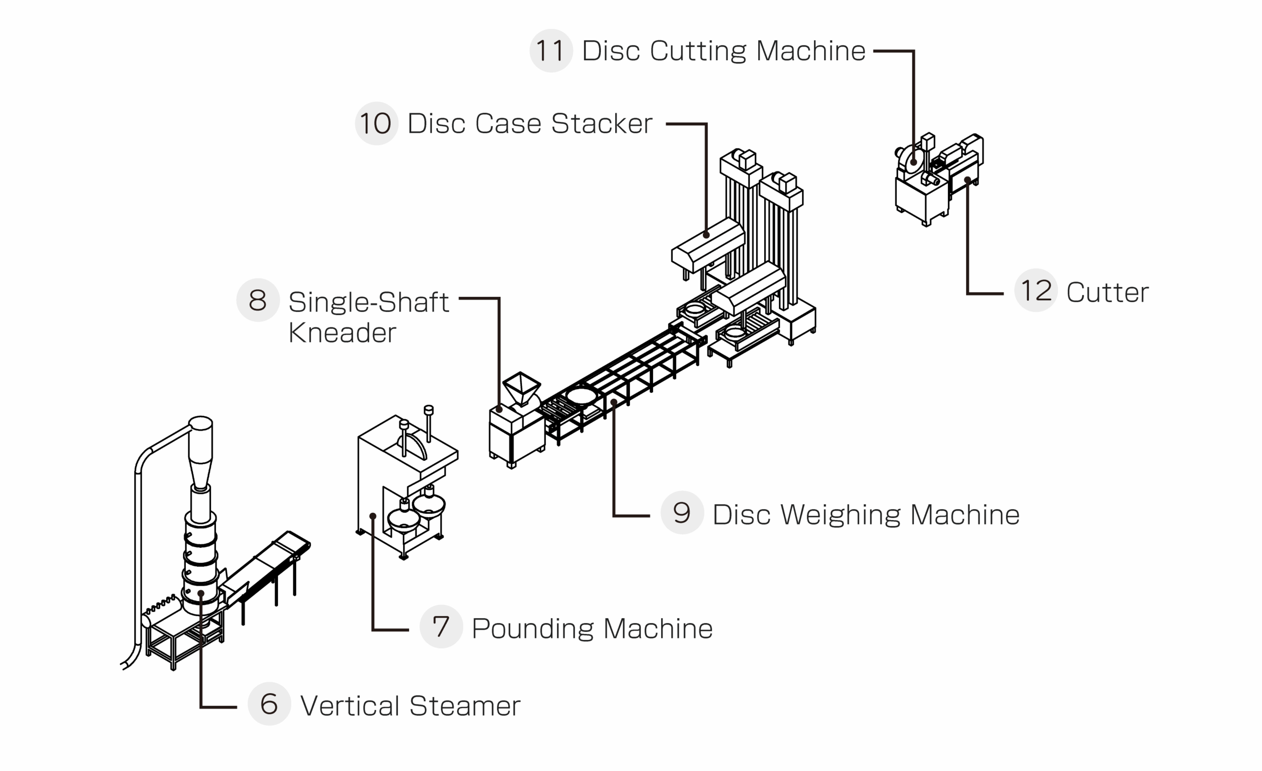We design and manufacture plant systems that integrate all production processes. Each system is customized to meet the specific applications and needs of our customers.Below are the “Steaming,” “Pounding,” “Kneading,” and “Forming” sections of the entire Arare Rice Cracker Production System process.