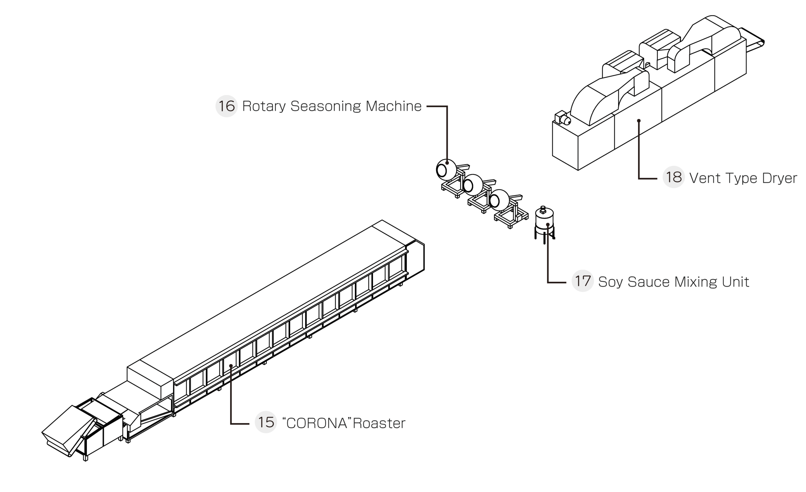 We design and manufacture plant systems that integrate all production processes. Each system is customized to meet the specific applications and needs of our customers.Below are the “Baking” and “Seasoning” sections of the entire Arare Rice Cracker Production System process.