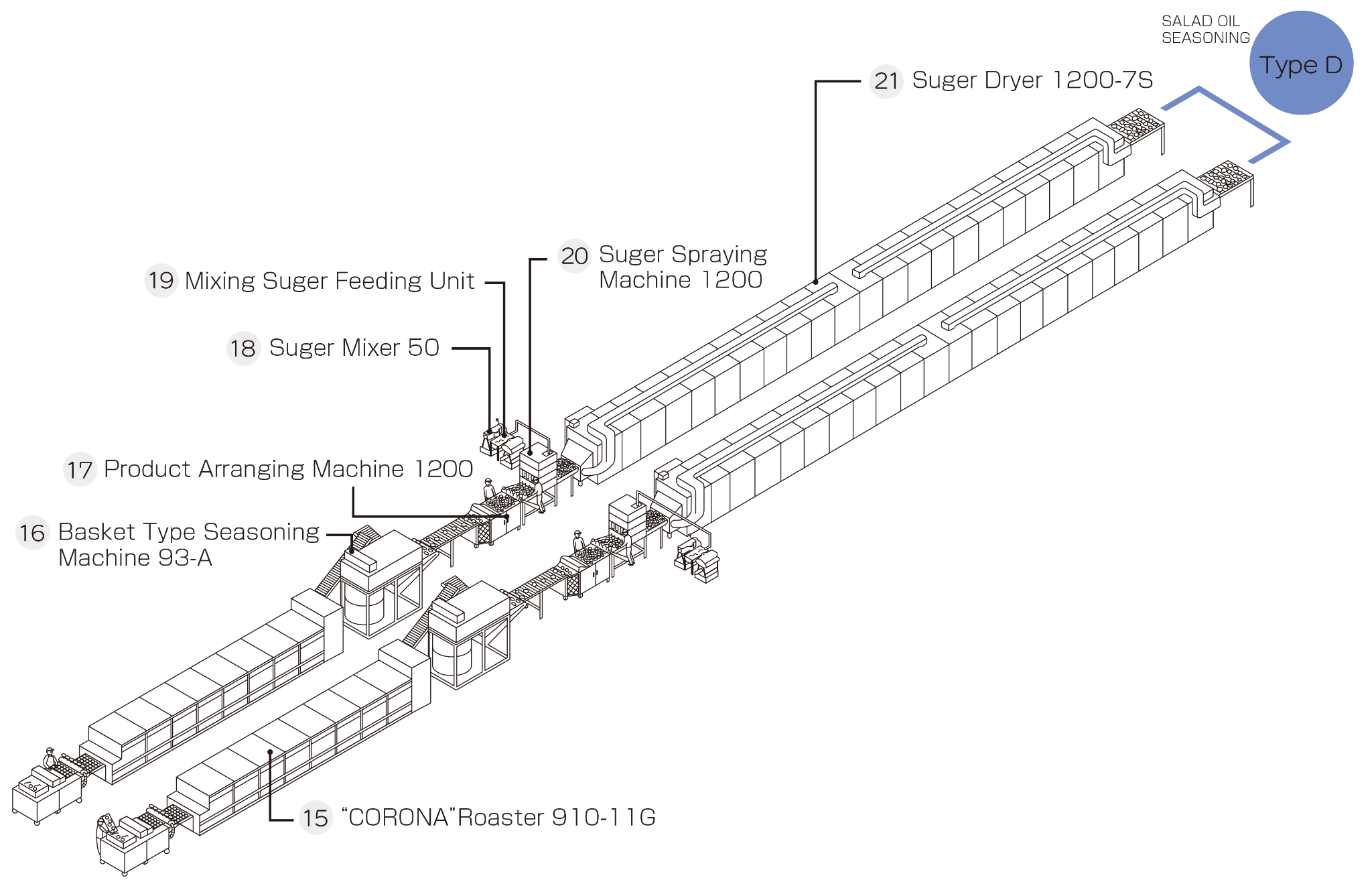 We design and manufacture plant systems that integrate all production processes. Each system is customized to meet the specific applications and needs of our customers.Below are the “Baking” and “Seasoning” sections of the entire SNBI200 plant process.