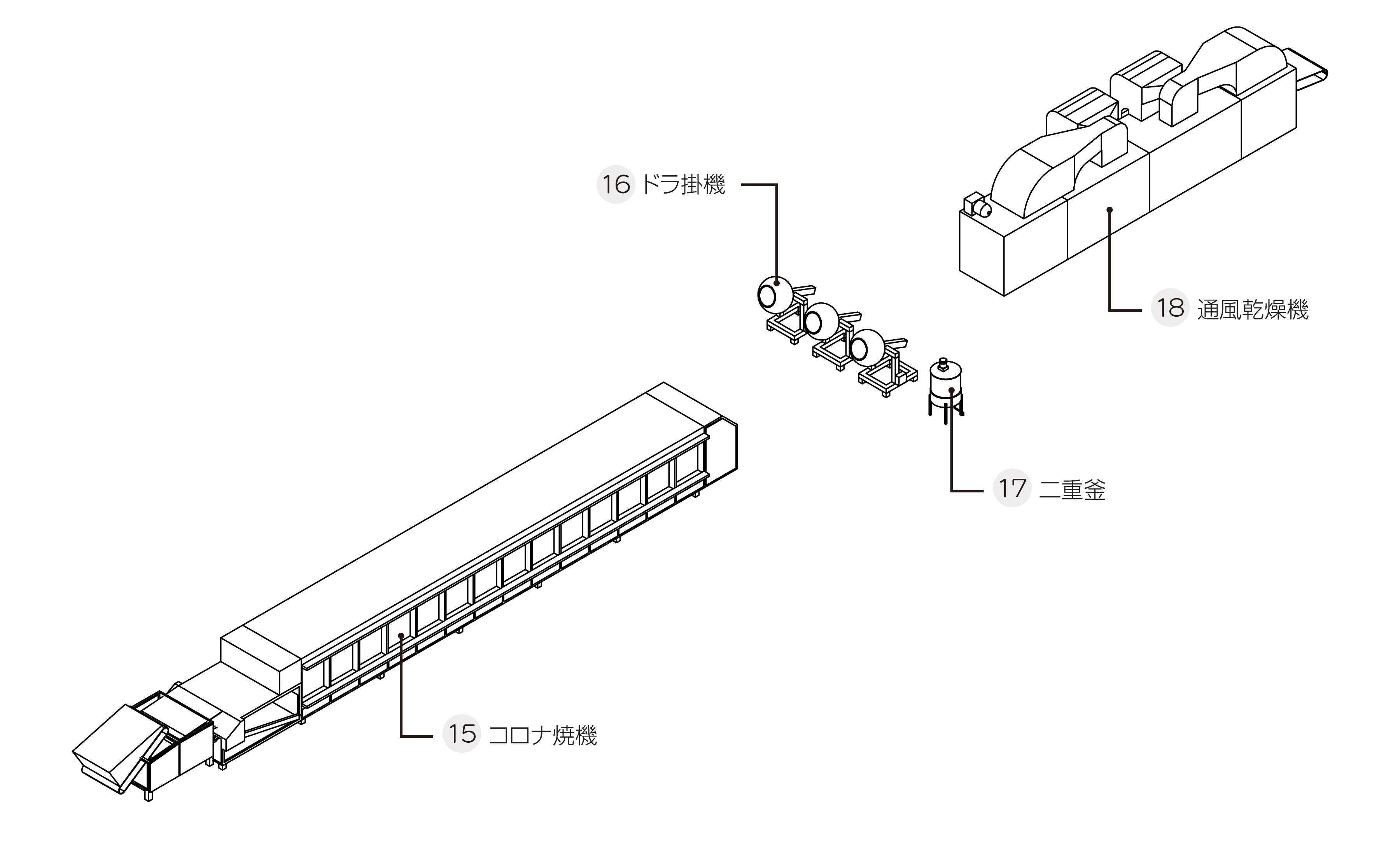 焼成・味付 全ての工程をつなぎ合わせたプラント設備を製作しています。お客様の用途・ニーズに合わせカスタマイズいたします。以下は、あられ設備 全工程内の「焼成」「味付」箇所となります。 コロナ焼機 手動ドラ掛け機 二重釜 通風乾燥機