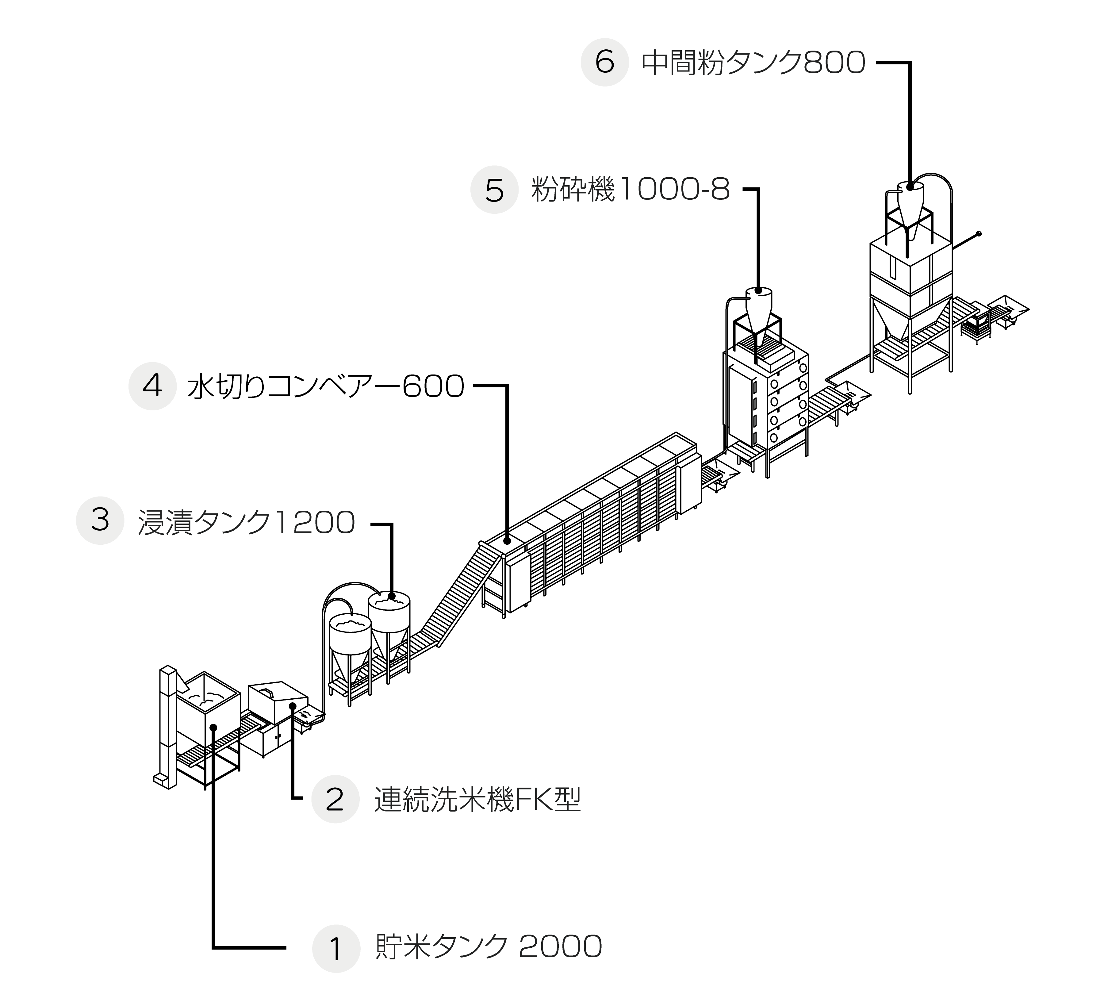 全ての工程をつなぎ合わせたプラント設備を製作しています。お客様の用途・ニーズに合わせカスタマイズいたします。以下は、プラントSNB200 全工程内の「洗米」「浸漬」「製粉」箇所となります。