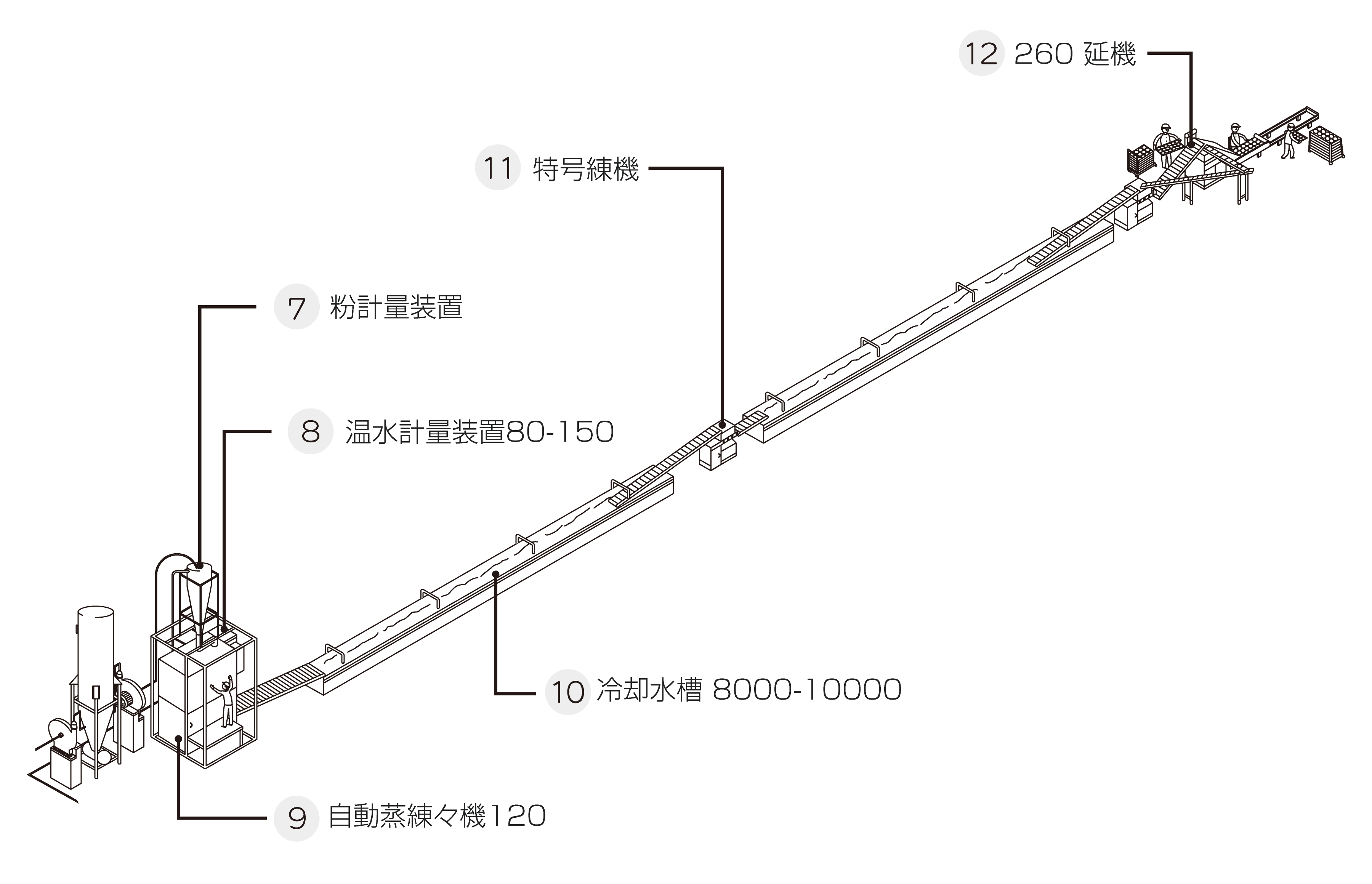 蒸す・練る・成形 全ての工程をつなぎ合わせたプラント設備を製作しています。お客様の用途・ニーズに合わせカスタマイズいたします。以下は、プラントSNBI200 全工程内の「蒸す」「練る」「成形」箇所となります。 粉計量装置 温水計量装置80-150 自動蒸練々機120 冷却水槽8000-10000 特号練機 260延機